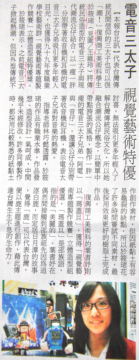 | 內容報導 | 電音三太子 視覺藝術特優 2010/12/30 【本報台北訊】代表台灣傳統民間信仰的三太子也可以很「潮!」復興商工美術科學生於筱珺(見圖/王維玲)將傳統民俗造型的電音三太子與現代潮流公仔結合,以一瘦一胖、分別帶著收音機和耳機的電音三太子兄弟吸引更多年輕人目光,也獲得九十九年度職業學校藝術群「視覺藝術專題製作競賽」立體造型組特優獎。 於筱珺表示,之前電音三太子掀起熱潮,但因外型傳統不討喜,無法吸引更多年輕人了解台灣傳統民俗文化,所以她融合潮流公仔概念,以簡單中帶點誇張的風格,製作一胖一瘦的電音三太子兄弟「阿電」與「音仔」,還讓公仔分別帶著收音機和耳機,表示電音太子兄弟對音樂的熱愛。 指導老師林巧懿透露,於筱珺的作品有職業水準,作品發想、造型設計一氣呵成,中間幾乎未經修改,許多同學製作時,都採用比較熟悉的紙黏土作創作素材,但因紙黏土有容易龜裂的缺點,所以於筱珺花了許多時間嘗試不同素材,最後採用效果更好的樹脂土完成作品。 復興商工美術科的葉書妤則以「瑪蓋旦」,獲得「視覺藝術專題製作競賽」立體造型組優選,「瑪蓋旦」是邵族語,指的是「美麗的」。葉書妤在偶然間接觸到邵族祖先因為追逐白鹿,而定居日月潭的故事,覺得「鹿」可以代表台灣,便以鹿主題進行創作,藉此傳達台灣生生不息的生命力。 | ||||
