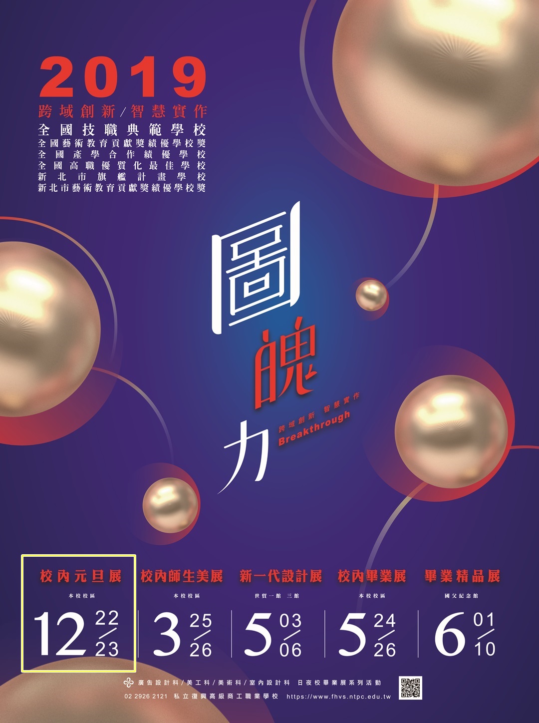 | 內容報導 | 復興商工元旦展 22日登場 記者蕭佳宜/臺北報導 新北市立復興商工年度盛事,校內元旦展將於12月22日至23日展出,作品強調技術創新,涵蓋面向多元,包括設計、繪畫、立體、平面、產品、包裝、工藝、數位、圖文傳播、媒體動畫、室內設計、資料處理等全方位作品。 今年展覽主題「圖魄力」著重真實及抽象的交融感,找出撼動人心的藝術獨特性,復興商工校長王志誠表示,此次展覽中,日、夜校的廣設科、美術科、美工科、室內設計科的學生展現創作能力與傳統藝術特色,秉持「大膽嘗試、精雕細琢」的創作理念,兼具品味、時尚,永不褪流行的風格美感,成功創出絕美藝術。 復興商工是國內著名美學教育的特色學校,歡迎民眾一同共襄盛舉這場值得期待且精采絕倫的藝術饗宴,欣賞復興商工學生的精湛專業技術。 | ||||