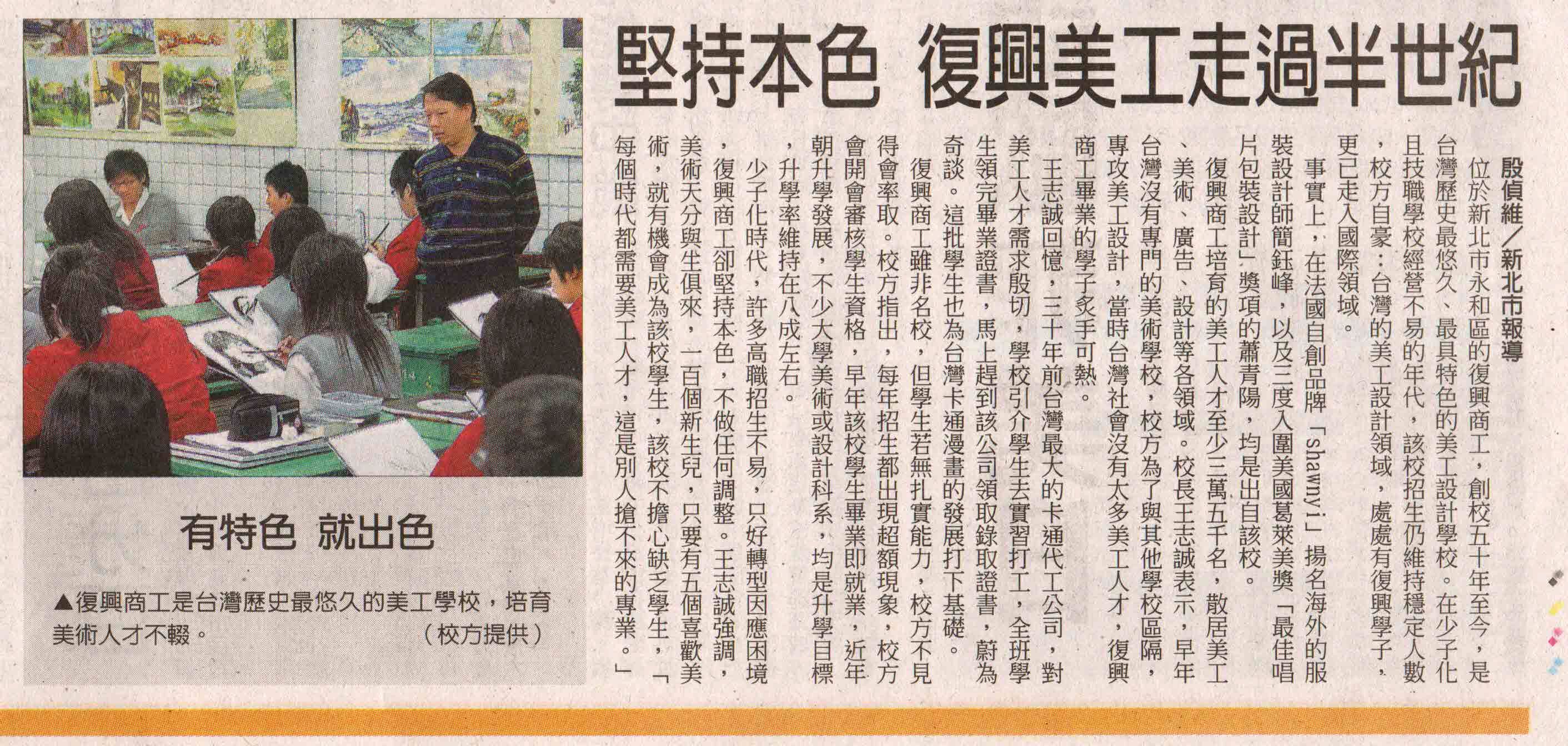 中國時報100年5月25日a6版學校特色刊登堅持本色復興美工走過半世紀